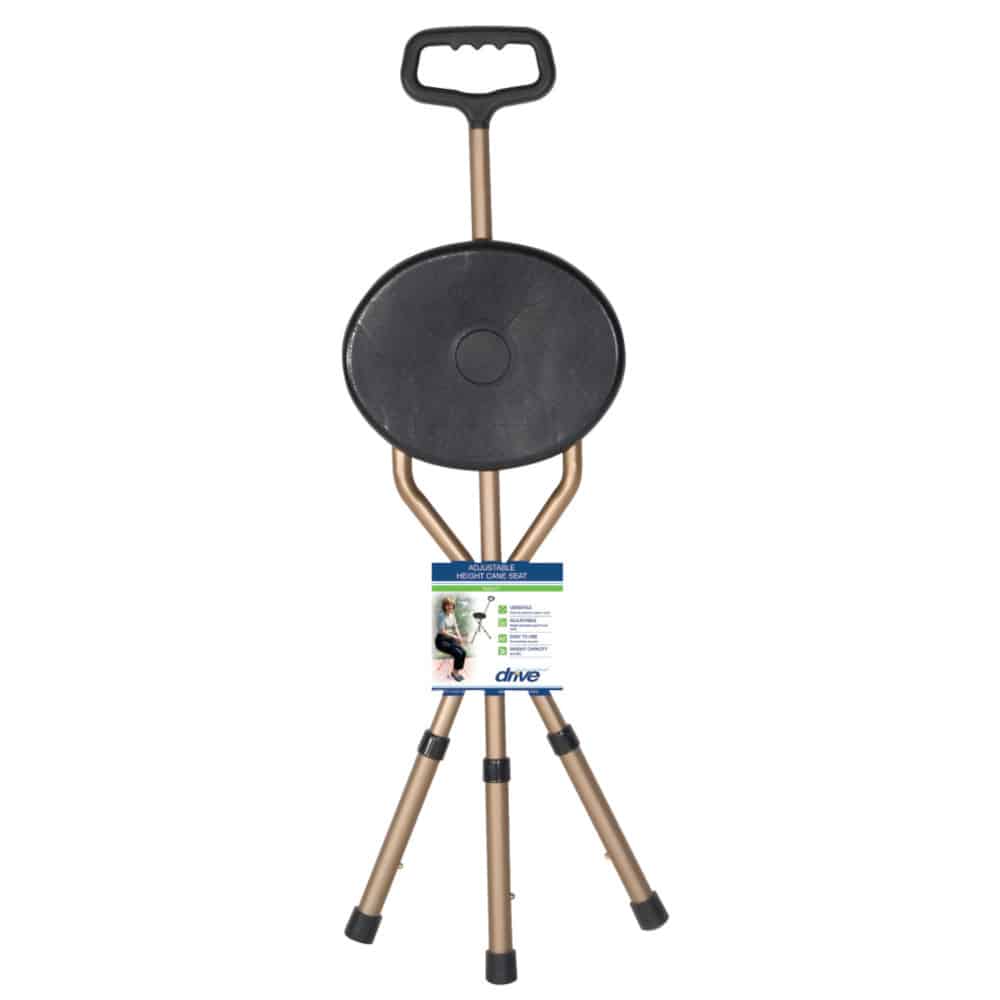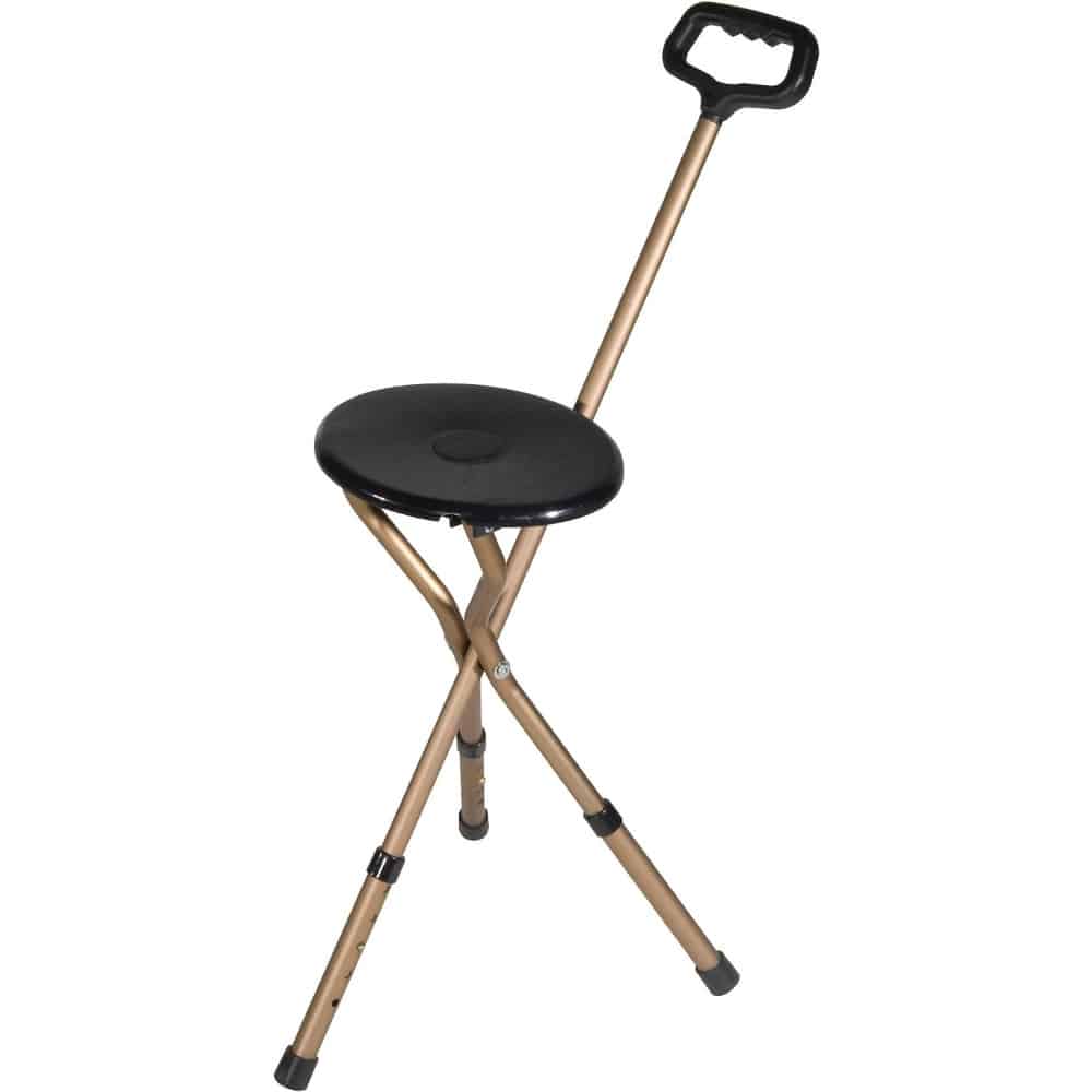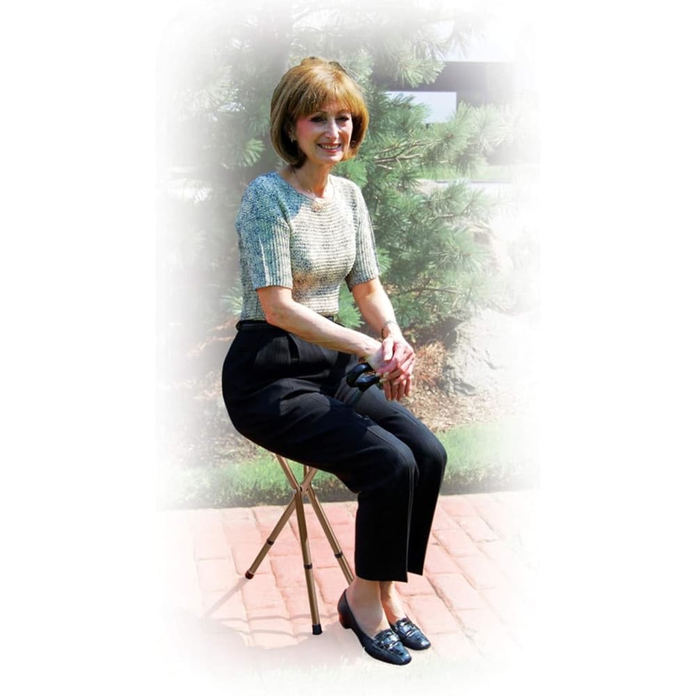 Tyylikäs kokoontaittuva kävelykeppi istuin -yhdistelmä. Suljettuna jykevä tuki ja avattuna miellyttävä istuin lepohetkeä varten. Kevyt ja vahva alumiinirunko, kolmijalkainen rakenne, kuminupit jalkojen päässä.
