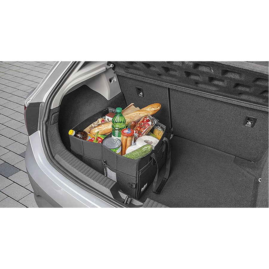 Älykäs ostoslaukku, joka sopii auton tavaratilaan ja pysyy paikoillaan tarrakiinnityksen ansiosta.
