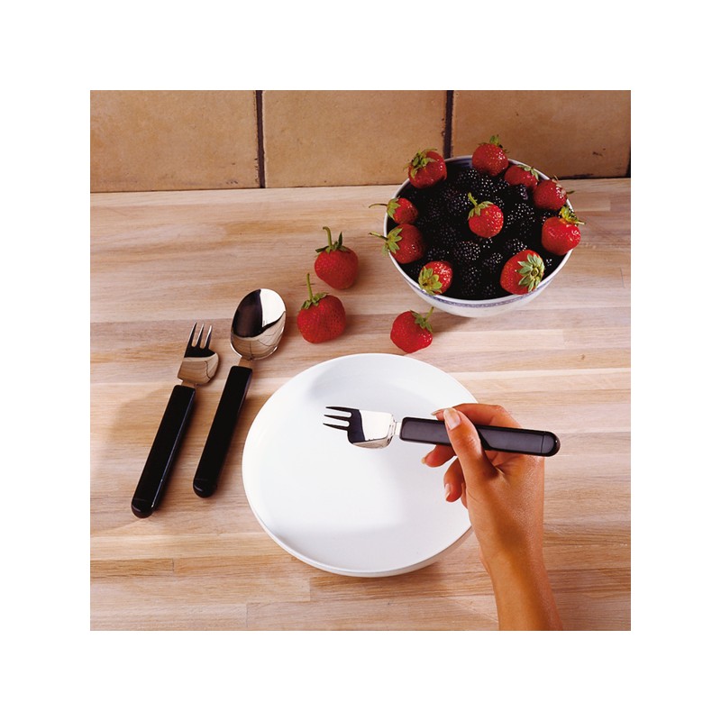 Kädensijan pyöristetyn alapuolen ja litteän yläpuolen ansiosta veitsi-lusikasta saa hyvän otteen. Veitsi-lusikka sopii sekä oikea- että vasenkätisille. Leikkuureuna on aterimen alapuolella suupielien vahingoittumisen välttämiseksi.