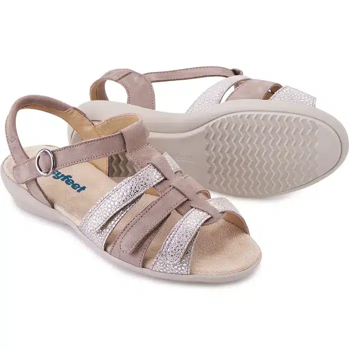 Callie sandaalien ansiosta voit nauttia mukavuudesta ja tyylikkyydestä yhtäaikaisesti. Sandaali sopii monille erilaisille jaloille tarrakiinnityksen ansiosta. Kolmen tarran kiinnitys mahdollistaa jalalle täydellisen muovautumisen sillä sen saa auki aivan kokonaan. Jalka voi olla, minkä muotoinen tahansa ja kenkä sopii kuin nenä päähän. Tämä sandaali sopii jokaiselle, olipa jalka turvonnut, leveälestinen tai vasaravarpaasta kärsivä. Naisten leveälestinen sandaali Callie on tukeva mukautuva, samalla antaen tyylikkään lisäyksen asukokonaisuuteen, joka sopii turvonneille jaloille. Kengät ovat ihana valinta kauniille kesäpäivä piknikille ja juhliin. Kengät sopivat myös toimistolle.