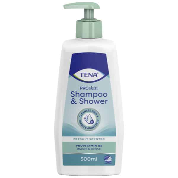 Suihkushampoo TENA Shampoo & Shower 500ml on mieto ja hellävarainen. Se soveltuu käytettäväksi sekä koko keholle että myös hiuksille. Se on suunniteltu erityisesti ikääntyvälle iholle ja hiuksille.