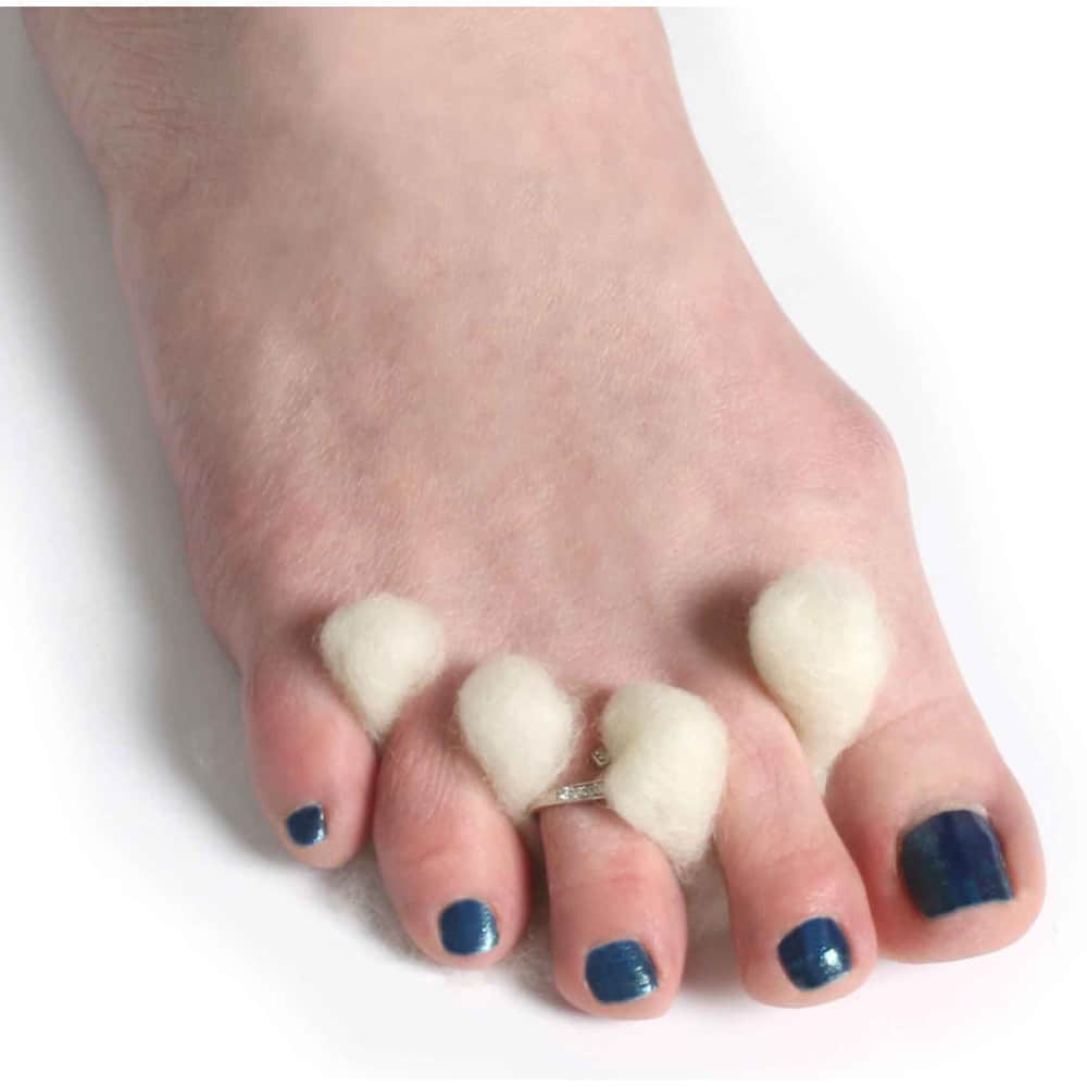 Pyörittele pitkulainen suikale villasta ja laita se yöksi varpaanväliin. Voit myös asettaa villaa varpaiden alle ja kietoa päällipuolelta varpaiden välistä. Älä vedä liian kireälle. Vaihda päivittäin