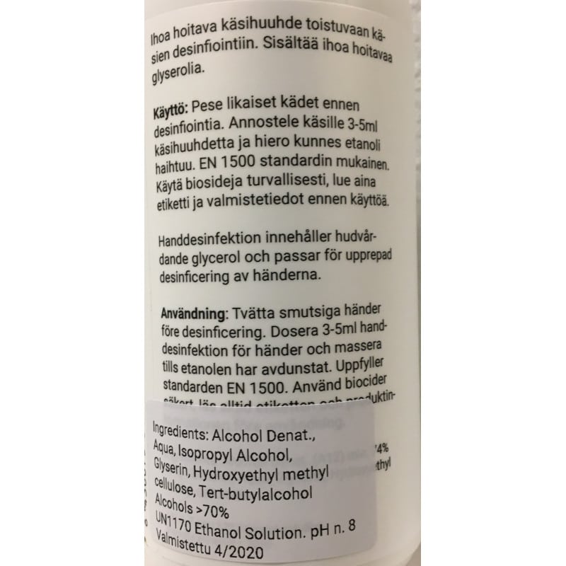 Käyttö: Pese likaiset kädet ennen desinfiointia. Annostele käsille 3-5 ml käsihuuhdetta ja hiero kunnes etanoli haihtuu. EN 1500 standardin mukainen. Käytä biosideja turvallisesti, lue aina etiketti ja valmistetiedot ennen käyttöä.