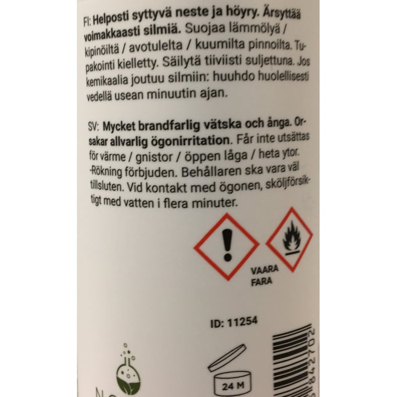 Sisältö: Alkoholiprosentti yli 70%, UN1170 etanoliliuos, pH n. 8