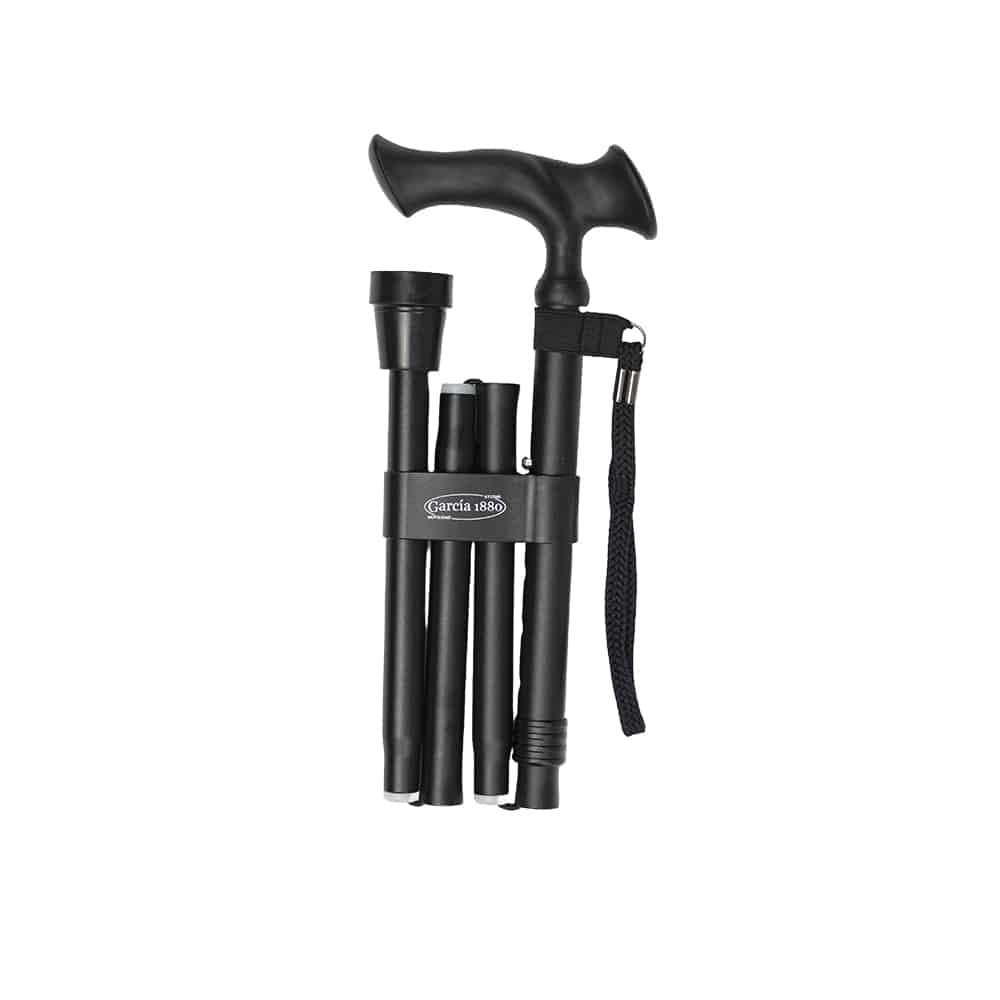 Kävelykeppi alumiini taitettava ergonominen kahva musta on valmistettu Espanjassa. Toimitukseen sisältyy muovinen säilytyspussi ja panta, mikä pitää kävelykepin kasassa sen ollessa taitettuna.
