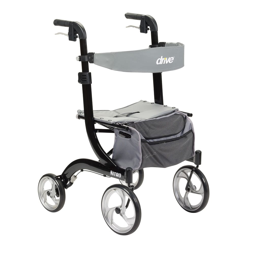 Ergonomisesti muotoillut ja korkeussäädettävät kädensijat mahdollistavat oikean asennon jokaiselle käyttäjälle. Rollaattori Nitro on helppo laittaa kasaan kuljetusta varten vaikka yhdellä kädellä istuimessa olevan nostokahvan ansiosta.