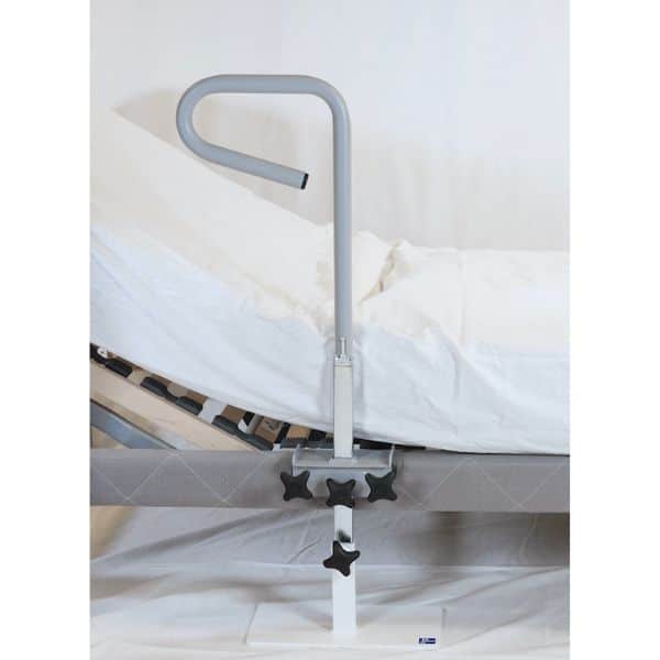 Nousutuki sormiruuvikiinnitys kääntyvä malli lattiatuella moottoroituun sänkyyn voidaan asettaa kolmeen eri asentoon ilman työkaluja. Se on helppo kiinnittää, varastoida ja kuljettaa. Se tarjoaa hyvän tuen sekä lattiasta että sängyn laidasta. Nousutukea voi säätää portaattomasti korkeussuunnassa. Kiinnitys tapahtuu sormiruuveilla ilman työkaluja, mutta lattiatuen sormiruuvi voidaan vaihtaa kuusiokoloruuviksi (varaosa). Ylätuen pystyputki on kromattua terästä. Oteosa, laitakiinnitysosa ja jalka ovat pulverimaalattua terästä. Nousutuen oteosan väri on harmaa. Lattiatuen korkeus on 31 cm ja sängynlaidan maksimipaksuus on 45 mm.