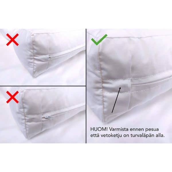 Pesu 60°C väljässä vedessä. Käytä pesuainetta noin kolmasosa tavallisesta määrästä. Kuivausrumpu on sallittu, mutta käytä matalaa lämpötilaa. HUOM! Varmista ennen pesua, että tyynyn vetoketjun vedin on turvaläpän alla, jotta se ei aukea pesun aikana (katso kuva!).