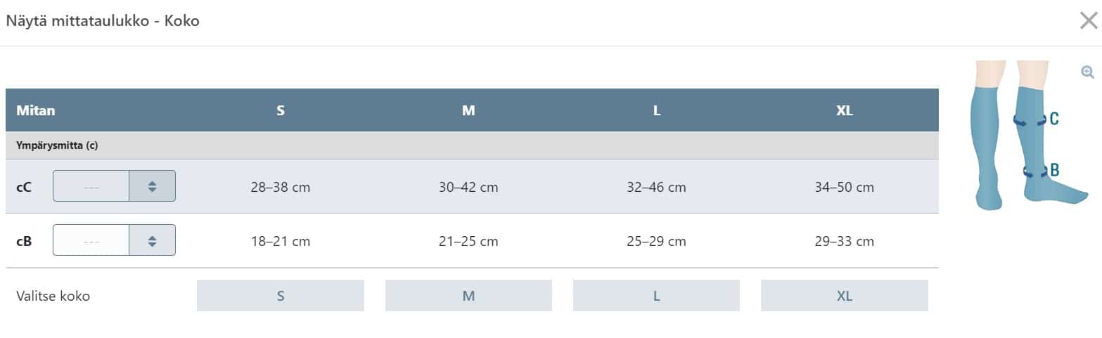Mittaa nilkan ympärys nilkan kapeimmasta kohdasta ja pohkeen ympärys pohkeen paksuimmasta kohdasta.