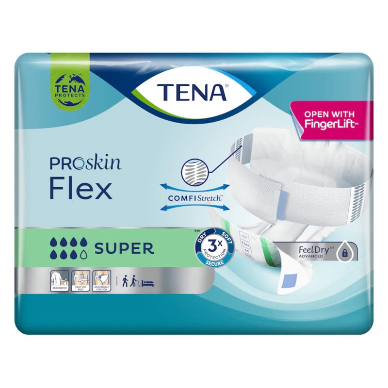 TENA Flex Super on joustava, vyöllinen inkontinenssisuoja, jonka vaihto on helpompaa ja ergonomisempaa. Tuote sopii sekä täysin että osittain liikuntakykyisille kuin myös liikuntakyvyttömille henkilöille. TENA ProSkin Flex -suojan FeelDry Advanced™ -teknologian ansiosta tuote imee virtsan nopeasti pois suojan pinnalta ja pitää näin ihon kuivana. Nopeasti imevä imuydin lukitsee jopa suuren virtsamäärän hetkessä, jolloin suojan pinta myös pysyy kuivana. Täysin hengittävä ConfioAir™-taustamateriaali antaa ihon hengittää.